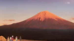 夕方になり、子供たちは帰って行きお礼にクッキーをもらった。それをココアと一緒に食べていると、グビ姐が起き出して来て、ココアにラム酒を入れて飲み出した。背景には綺麗な赤富士。