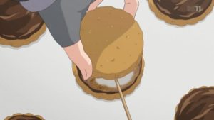 腹を空かせたナデシコのためにリンが焼きマシュマロをチョコビスケットで挟むスモアを作ってあげる。