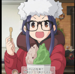 りんが続いてくるが、行き違いで違うサイトにテントを張ってしまう。そこへなでしこが姉に連れられいつものように出勤。千明からは近所の樹海牧場で牧場スイーツを食べている様子がメッセで送られてくる。
