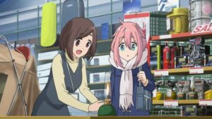 テストが終わって、野クルの三人は身延市へ向かう。目的地はアウトドアショップ、カリブーだ。ナデシコは早速ガスランプを見つけるが、4690円と少々お高い。結局、三人は手頃な銀マットを買う。そして千明はキャンプ用チェアーを気に入り、次のバイト代でこれを買うことを決める。