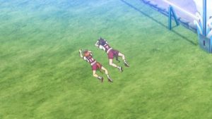 Aパートでレースの決着は着く。自転車部のひろみと比嘉がラスト一周でクマさんを捉える。比嘉はそこで肩の痛みが激しくなり後退、ところがスプリントに入ってクマさんの後ろから伸びてきたのはママチャリの東先輩だ …