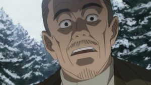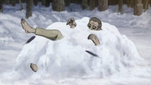 秘密を喋りすぎた男は杉元を殺そうとするが、203高地でも死ななかった猛者に見破られて、逃げ出してしまう。すぐに追いかけるが、もう男は雪饅頭に埋まって息をしていない。外に出すと内臓を羆に食われている。