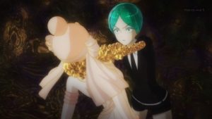 フォスが冬に見つけたルビーを使って231年ぶりにパパラチアが目覚めた。パパラチアは久しぶりに会ったフォスの変貌ぶりに驚き関心を持つ。散歩をしながらフォスが月人と話したいと言うと、パパラチアは「正しいことが傷つけることもある。だから冷静に、慎重にな」と答えたと思うと、腰から崩れ落ちて再び長い眠りに入る。