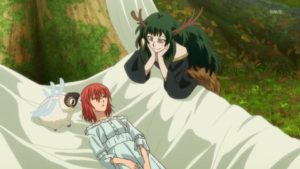 家に帰ってあと、2週間もチセは寝込んでしまった。エリアスもサイモンも心配で見に来る。そこへ妖精の女王ティターニヤと従者スプリガンがやって来た。サイモンをバシルーラで吹っ飛ばした後、テイターニヤがエリアスと言葉を交わしていると、どこから現れたか妖精王オベロンがチセにちょっかいを出し始める。オベロンはチセにマナを補給して目を覚まさせる。オベロンはチセに早く子供を作れと言う。それにはエリアスが胸キュンならぬ内蔵キュンになってしまう。