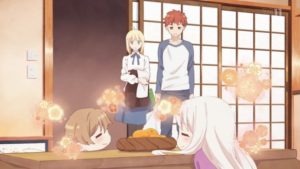 衛宮家には大河先生とイリアが遊びに来て、しかもこたつを持ち込んでgdgdになってしまった。そこにセイバーまでこたつに飲まれてしまう。